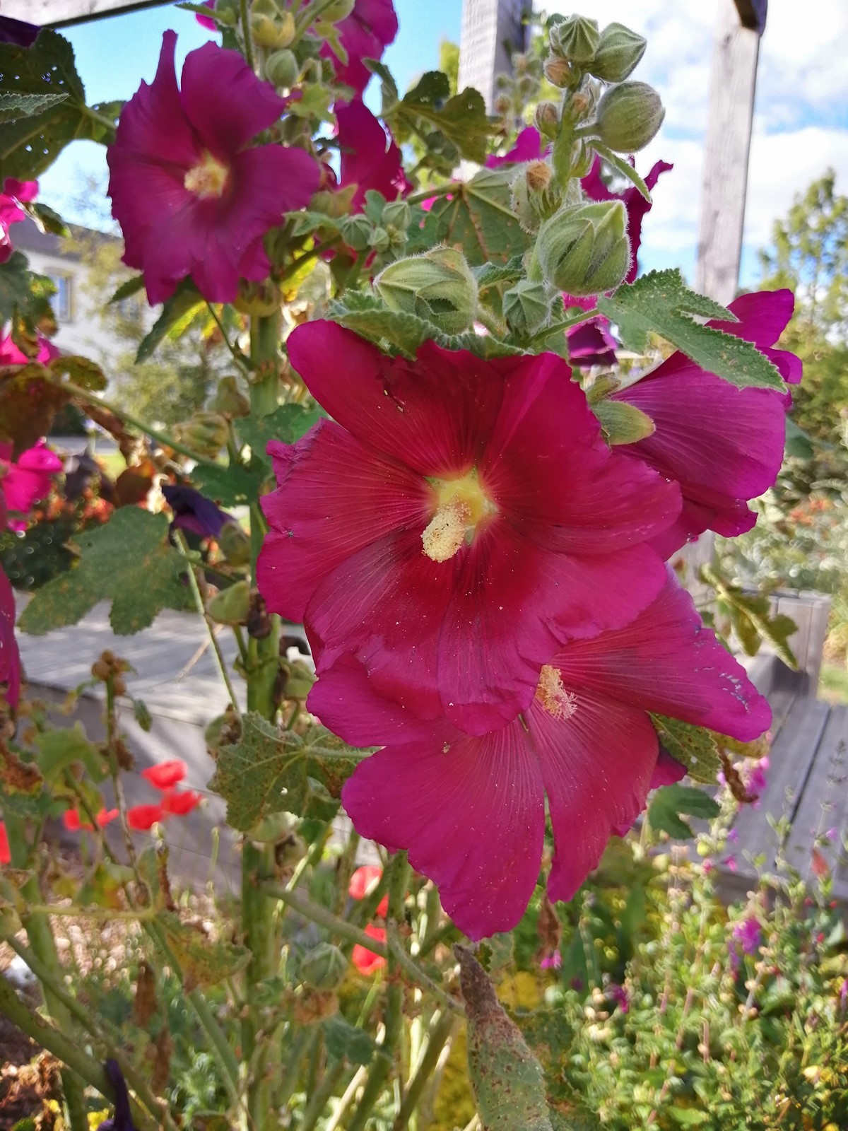 Nom Français : Rose trémière (et non "rose crémière" comme je l'entends encore trop souvent !)